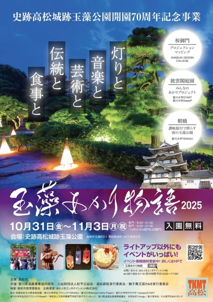 史跡高松城跡玉藻公園開園70周年を記念した特別イベントです。子供たちと大学生による公園内のライトアップや、灯りと音楽、芸術、伝統、食事が融合した幻想的な空間が広がります。