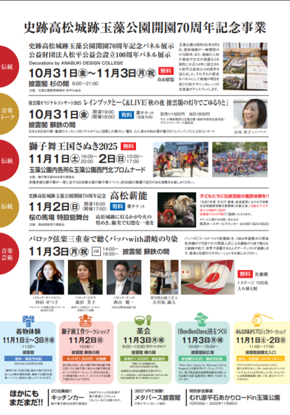 11月1日(土)16時から20時と11月2日(日)10時から17時には、玉藻公園内各所と玉藻公園西門北プロムナードで「獅子舞王国さぬき2025」を開催。多種多様な獅子舞が一堂に会する日本最大級の獅子舞イベントで、約50組の華麗で迫力のある演舞が楽しめます。