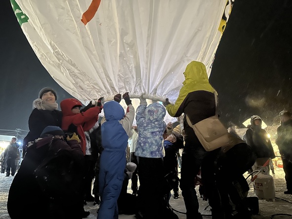 この紙を貼り合わせ、3メートル~6メートルもの巨大な紙風船を作ります。紙風船には武者絵や美人画が描かれるほか、「合格祈願」や「交通安全」「家内安全」など、その年一年間の願いを紙風船に書き、天に思いが届くようにと真冬の夜空に打ち上げます。