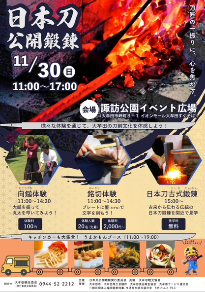 福岡県大牟田市(おおむたし)にある「諏訪公園」イベント広場で、2025年11月30日(日)に、「日本刀公開鍛錬Withキッチンカー大集合」が開催されます。
