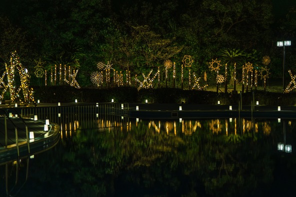 さまざまな細工を施した竹灯りのオブジェが水面に映り、光のゆらめきが幻想的な風景を作り出します。