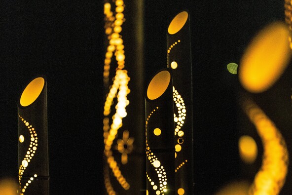 地元の「灯り人」たちが竹林の伐採から加工まで手作業で作り上げた竹灯りを、より多くの人に楽しんでもらうために、ホテルでの期間展示を2021年より行っています。