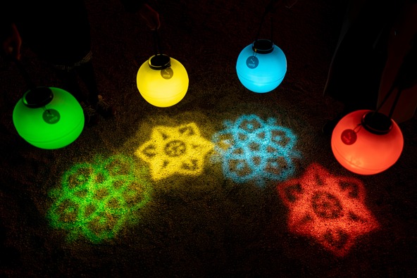 有料レンタルのNAKEDディスタンス提灯(1個500円)を手に持ち、夜の神苑を巡る体験もできます。提灯は四神にちなんだ4色展開で、大極殿前では光の提灯を使ったインタラクティブアートで四神への祈りを届けられます。
