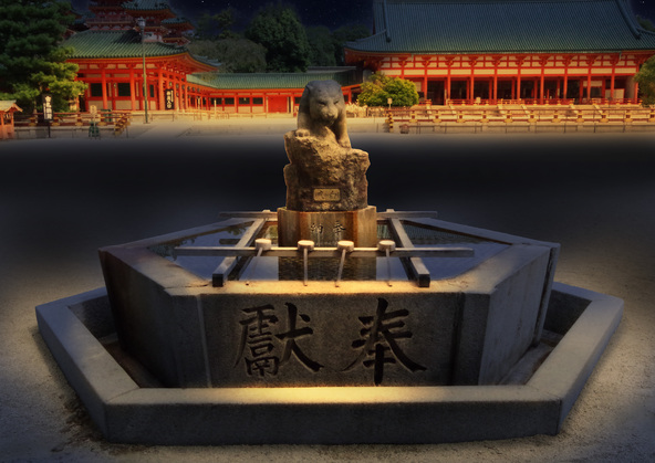 イベントでは「祈り」をテーマに、様々な光の演出が楽しめます。平安神宮の象徴・應天門のライトアップから始まり、手水舎では四神の物語がスタートします。