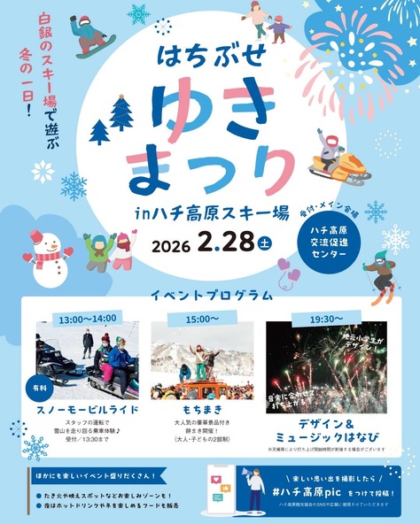 | 開催時間 | 13:00~14:00 スノーモービルライド(有料) 15:00~ もちまき(大人・子ども2部制) 19:30~ デザイン&ミュージックはなび |