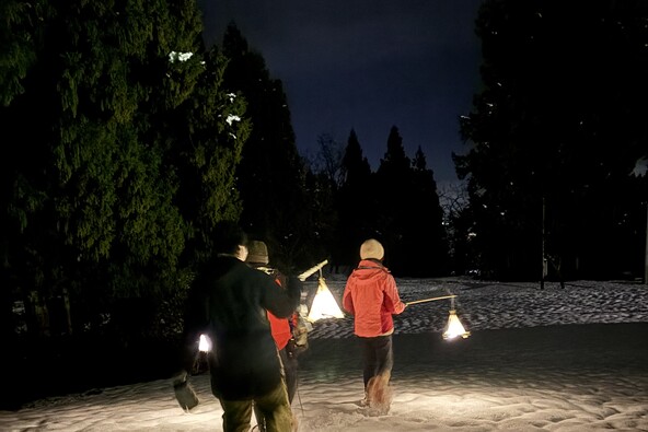 標高262mの小さな里山「駒見山」の麓で、地元の和紙職人から譲り受けた木の枝と和紙を使った手作りランタンで足元を照らしながら、魚沼の雪の夜の森をゆっくり冒険できるツアーです。