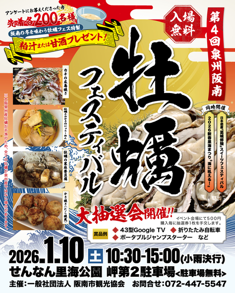 大阪府阪南市のせんなん里海公園岬第2駐車場で、2026年1月10日(土)に「第4回泉州阪南牡蠣フェスティバル」が開催されます。