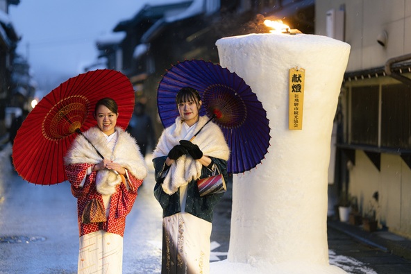 着物を着て、雪とろうそくの灯りに彩られた飛騨古川の町並みを巡る、特別な体験ができます。