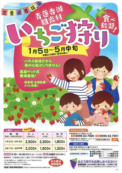 三重県名張市の「青蓮寺湖観光村」では、2026年1月5日(月)から5月中旬まで、いちご狩りを楽しめます。