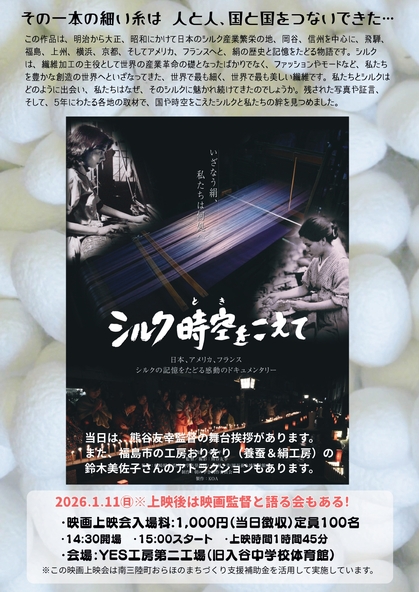 当日は熊谷友幸監督による舞台挨拶を予定しています。また、福島市で養蚕と絹織物に取り組む「工房おりをり」の鈴木美佐子さんによるアトラクションもあります。