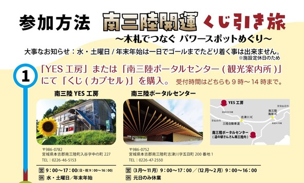 参加するには、南三陸YES工房または南三陸ポータルセンター(観光案内所)で、カプセル入りのくじを購入します。受付時間はどちらも9時から14時までです。