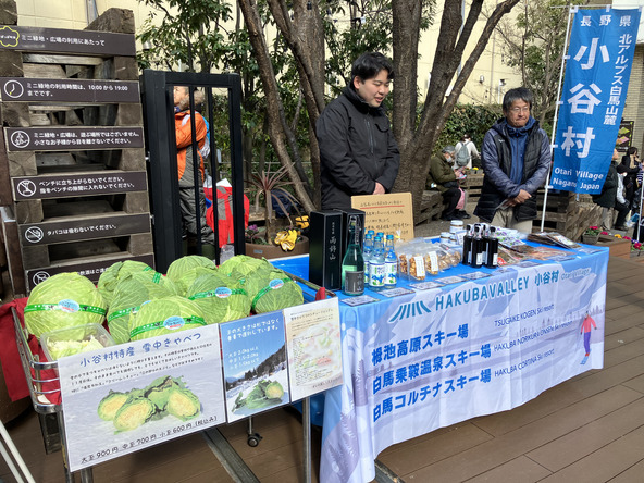 小谷村の深い雪の中で育った甘くて大きな雪中キャベツ、お醤油味でごはんに炊き込んでもおいしい小谷漬、雪どけサイダーなど、小谷村ならではの特産品の販売もあります(収穫状況によって変更の場合があります)。また、スキー場をはじめとする観光案内のブースも設けられます。