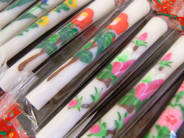 ろうそくには菊や牡丹、藤といった四季の花々が鮮やかに手描きされており、芯を作るところから蝋をかけ、削り、磨き、絵を描き、最後の仕上げまで、すべての工程が職人の手によって丁寧に行われています。