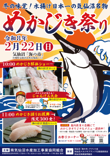 宮城県気仙沼市の「気仙沼「海の市」」で、2026年2月22日(日)に「めかじき祭り」が開催されます。