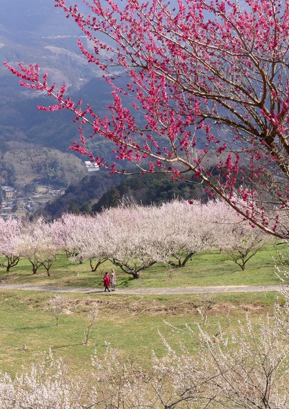 伊豆市にある「伊豆月ヶ瀬梅林」は、天城連山を一望できる雄大なロケーションが自慢の梅林です。約6.2ヘクタールの広大な敷地に、およそ1,500本の梅が咲き誇る様子は圧巻の一言。