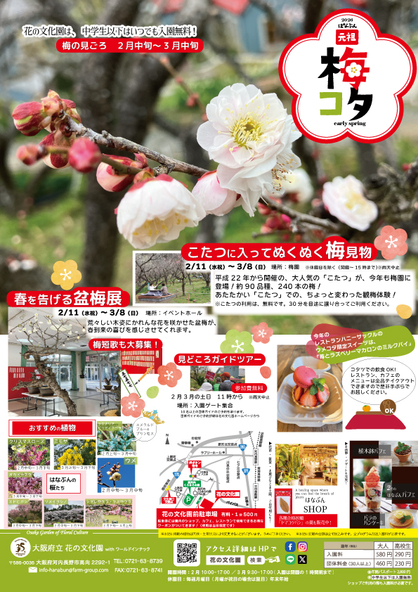 こたつで梅を眺め、限定スイーツも味わえる「大阪府立花の文化園」。春のおでかけに、ぜひ足を運んでみてはいかがでしょうか。