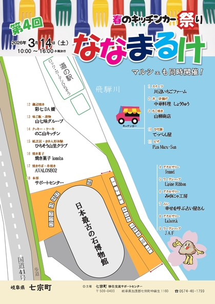 岐阜県七宗町(ひちそうちょう)で、2026年3月14日(土)に「第4回春のキッチンカー祭り ななまるけ」が開催されます。