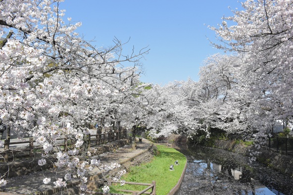 「若泉公園」周辺では、元小山川沿いに桜が並び、川の水面に花びらが広がる春ならではの風景が楽しめます。