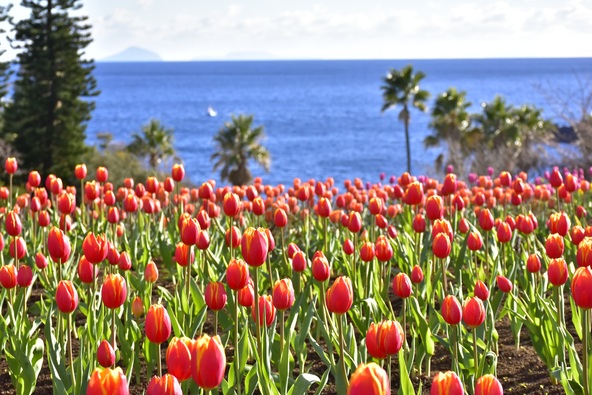 園内では、エントランス付近の花壇にカラフルなアイスチューリップが咲き誇っています。また、伊豆大島を望む岬の花畑では、菜の花と海とのコントラストが美しく、一面の菜の花が競うように咲き誇っています。