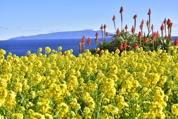 園内では、寒桜をはじめアイスチューリップ、菜の花、キダチアロエなど、カラフルな春の花々が一足早く咲き誇り、城ケ崎海岸や伊豆大島を望む絶景とともに楽しめます。