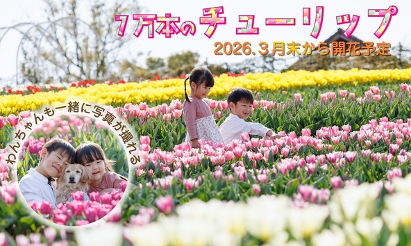 菜の花の後は、2026年3月下旬~4月中旬に6色・7万本のチューリップの花畑も楽しめます。