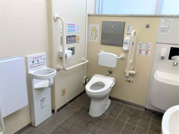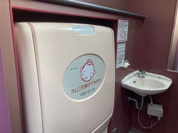 駐車場には、妊婦の方が利用できる屋根付き駐車スペースが設置されています。24時間利用できるトイレには、ベビーベッドとシンクを備えた授乳室や、おむつ交換台とベビーチェアを備えたバリアフリートイレを配置し、男女の各エリアにベビーベッドを据え付けた個室も用意されています。