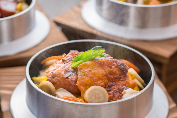 柔らかな食感が持ち味の鶏肉を炊き込んだ釜めしは、そのまま味わうのはもちろん、だし汁をかけてお茶漬け風にアレンジすることもでき、2通りの楽しみ方ができる一品です。