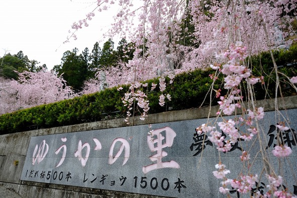 徳島県神山町にある「ゆうかの里」は、山一面に咲くしだれ桜とレンギョウが美しい花の名所です。
