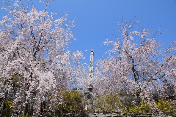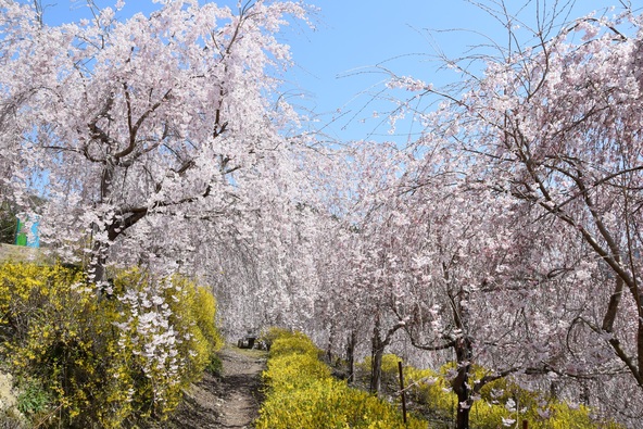 開花時期を迎えると、山全体が500本を超えるしだれ桜と、黄色い花を咲かせる2,500本のレンギョウに覆われます。ピンク色と黄色が組み合わさった色合いは、春ならではの装いです。
