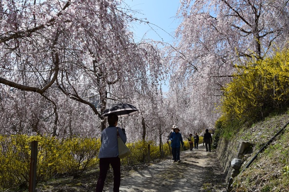 500本超のしだれ桜とレンギョウが織りなすピンクと黄色の絶景