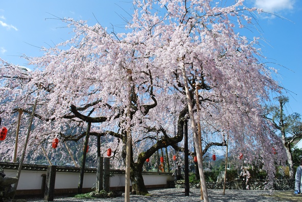 高さ約10メートルもあろうかという大きな木から枝が垂れ下がり、風になびくしだれ桜の控えめで優美な姿は、独特の趣と美しさがあります。山門の白い壁の向こうに、まるで花の滝のような景観を作り出しています。