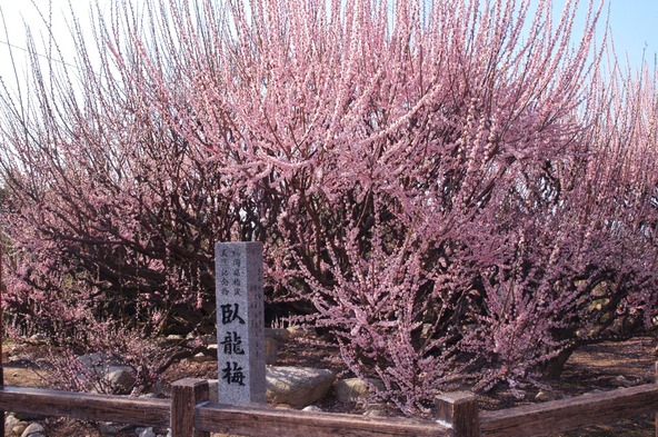 樹齢500年以上と言われる県指定天然記念物の紅梅で、地を這う龍のような姿が特徴です。