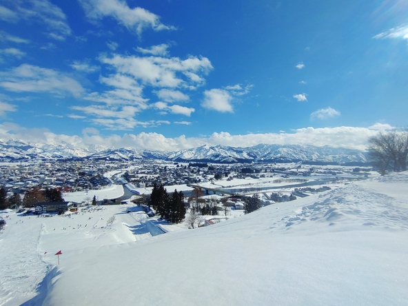 公園からは市街地はもちろん、遠くには越後三山を見渡すことができ、眺望の良さも魅力のひとつです。越後三山や魚野川を背景に咲き誇る桜は格別で、例年夜にはぼんぼりが灯され、昼間とはまた異なる幻想的な夜桜も楽しめます。