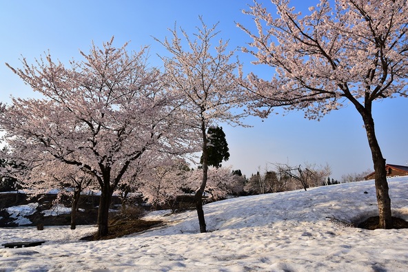 新潟県魚沼市の福山峠にある「福山峠のふるさと広場」は、雪が残る季節に桜の花が咲くという、豪雪地ならではの珍しい景色が楽しめるスポットです。