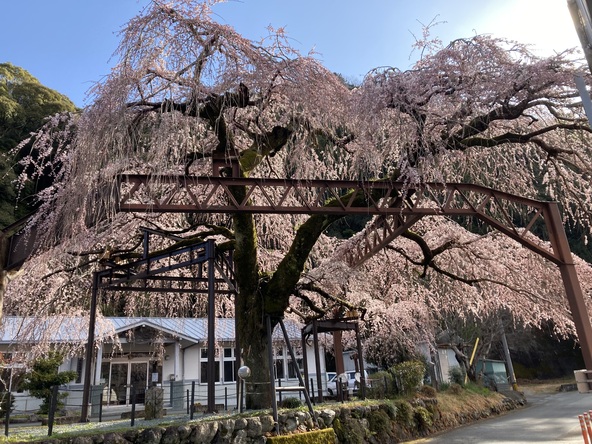 この枝垂れ桜は、樹高11m、根囲208m、胸高直径59cmの立派な姿をしており、およそ130年の歳月を重ねてきました。その美しい姿は、この地域周辺でも他に例を見ない銘木として、地元の人々から親しまれ続けています。桜の見ごろは例年3月下旬から4月上旬です。