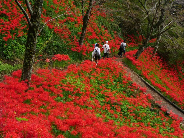 春には約1カ月かけてさまざまな種類の桜がかわるがわる開花し、秋には山の南斜面を真っ赤に染める55万本の彼岸花が迎えてくれます♪