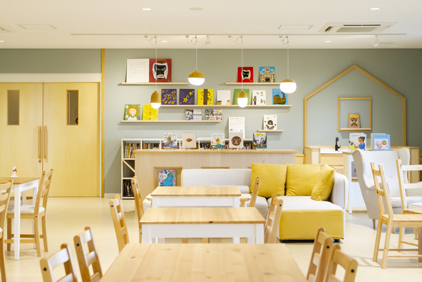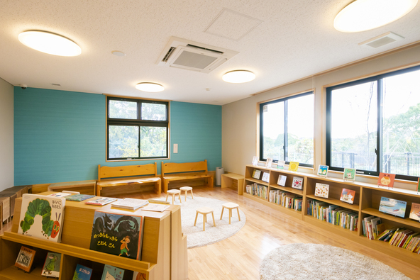 絵本の読み聞かせや、絵本を自由に読めるスペース。たくさんの絵本に囲まれて、子どもたちとゆっくり過ごせます。