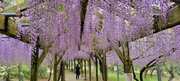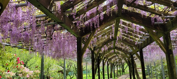 紫・緑・青空が重なる全長60mの藤棚