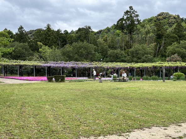 公園に整備された藤棚は全長60mにおよびます。晴れた日には藤の紫色と公園の緑、そして空の青が重なり合う、色鮮やかな景色を楽しめます。